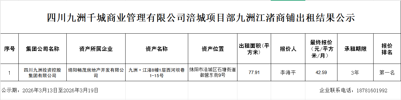 四川九洲千城商业管理有限公司涪城项目部九洲江渚商铺出租结果公示