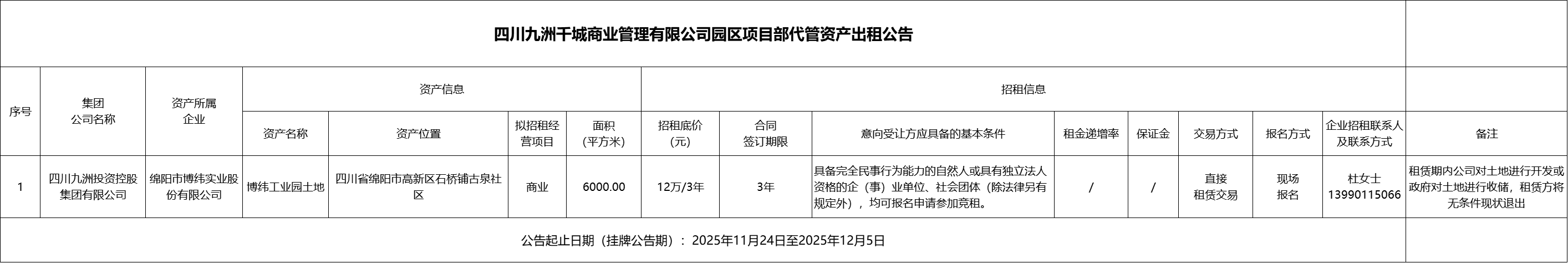 四川九洲千城商业管理有限公司园区项目部代管资产出租公告