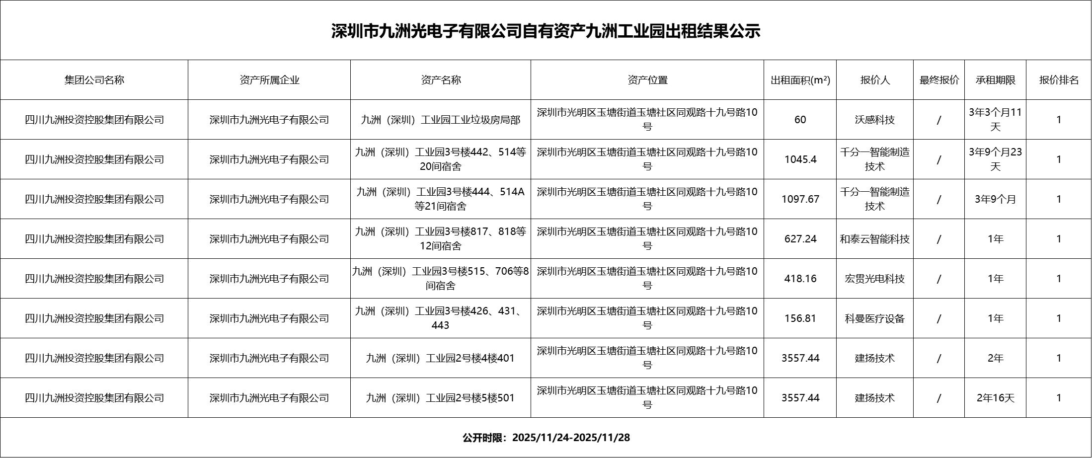 深圳市九洲光电子有限公司自有资产九洲工业园出租结果公示