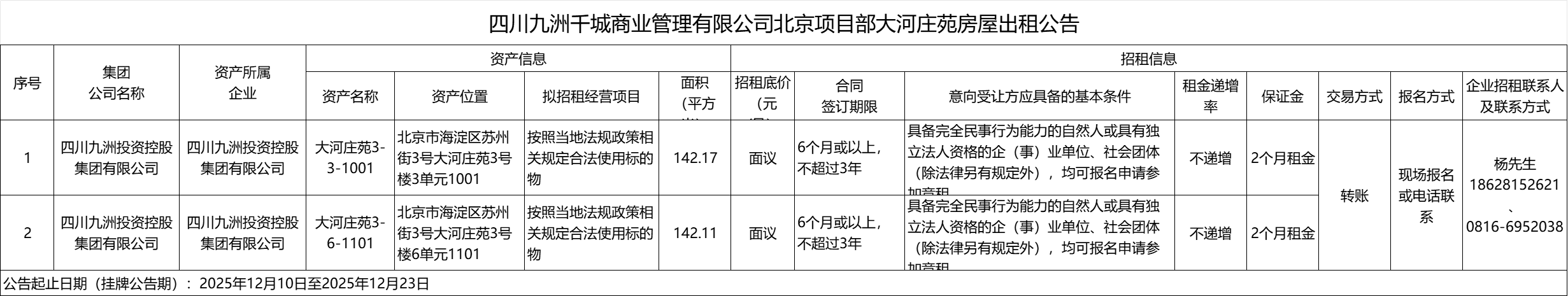 四川九洲千城商业管理有限公司北京项目部大河庄苑房屋出租公告