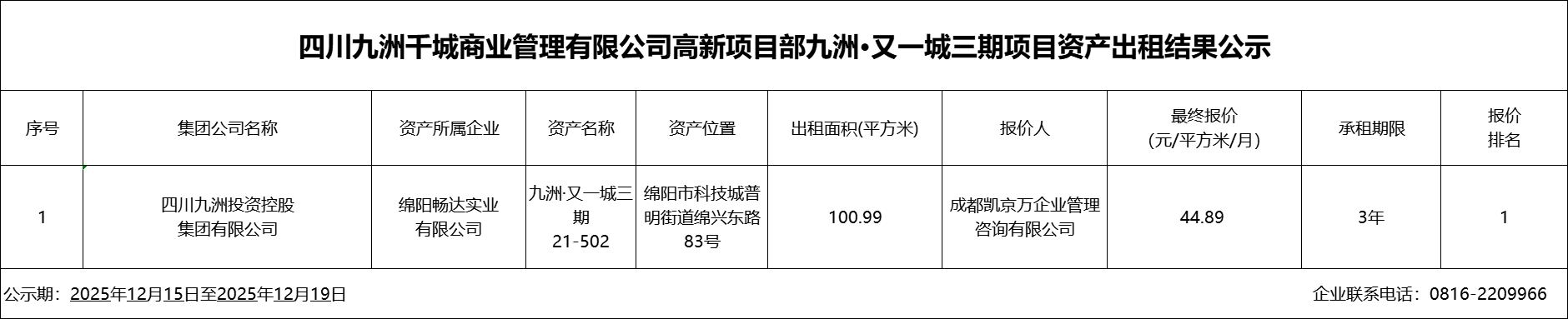 四川九洲千城商业管理有限公司高新项目部九洲·又一城三期项目资产出租结果公示