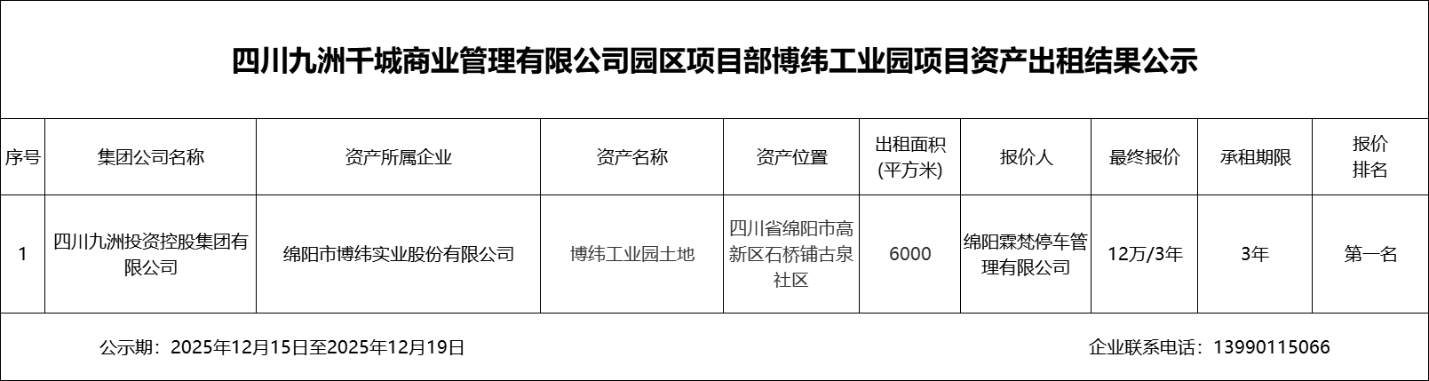 四川九洲千城商业管理有限公司园区项目部博纬工业园项目资产出租结果公示