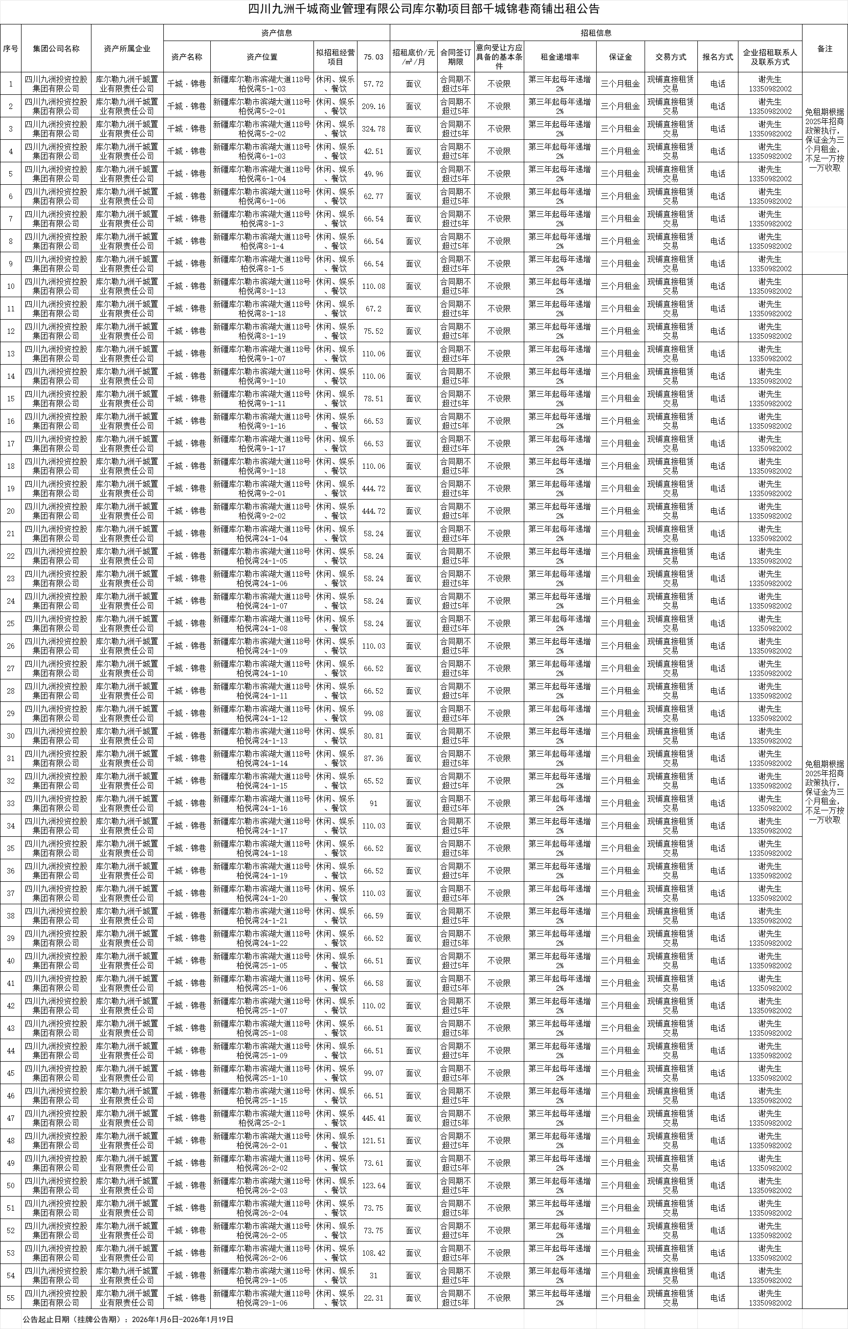 四川九洲千城商业管理有限公司库尔勒项目部千城锦巷商铺出租公告