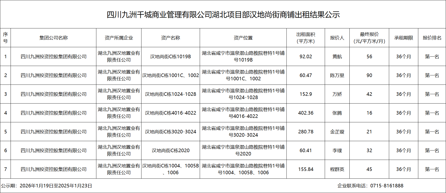 四川九洲千城商业管理有限公司湖北项目部汉地尚街商铺出租结果公示