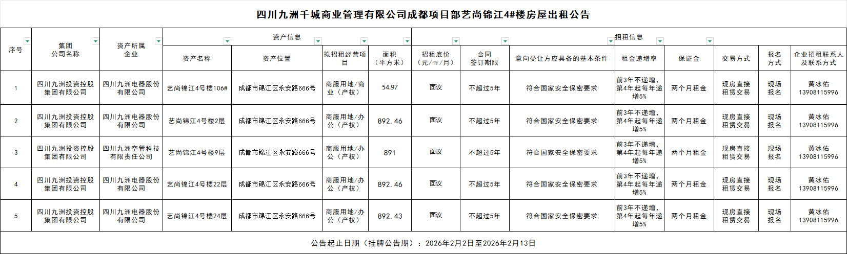 四川九洲千城商业管理有限公司成都项目部艺尚锦江4#楼房屋出租公告