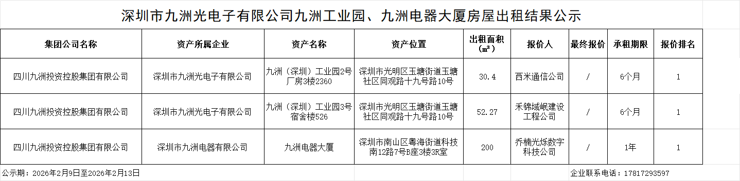深圳市九洲光电子有限公司九洲工业园、九洲电器大厦房屋出租结果公示