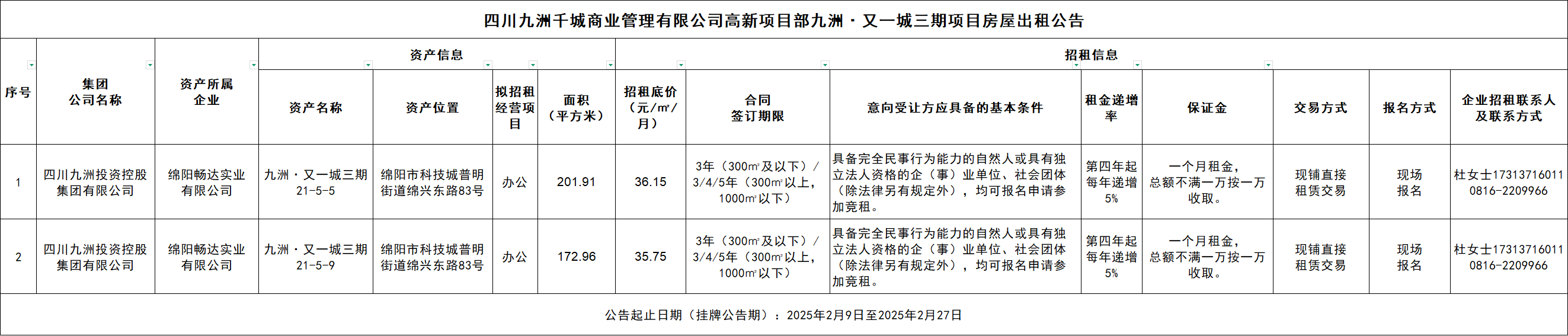 四川九洲千城商业管理有限公司高新项目部九洲·又一城三期项目房屋出租公告