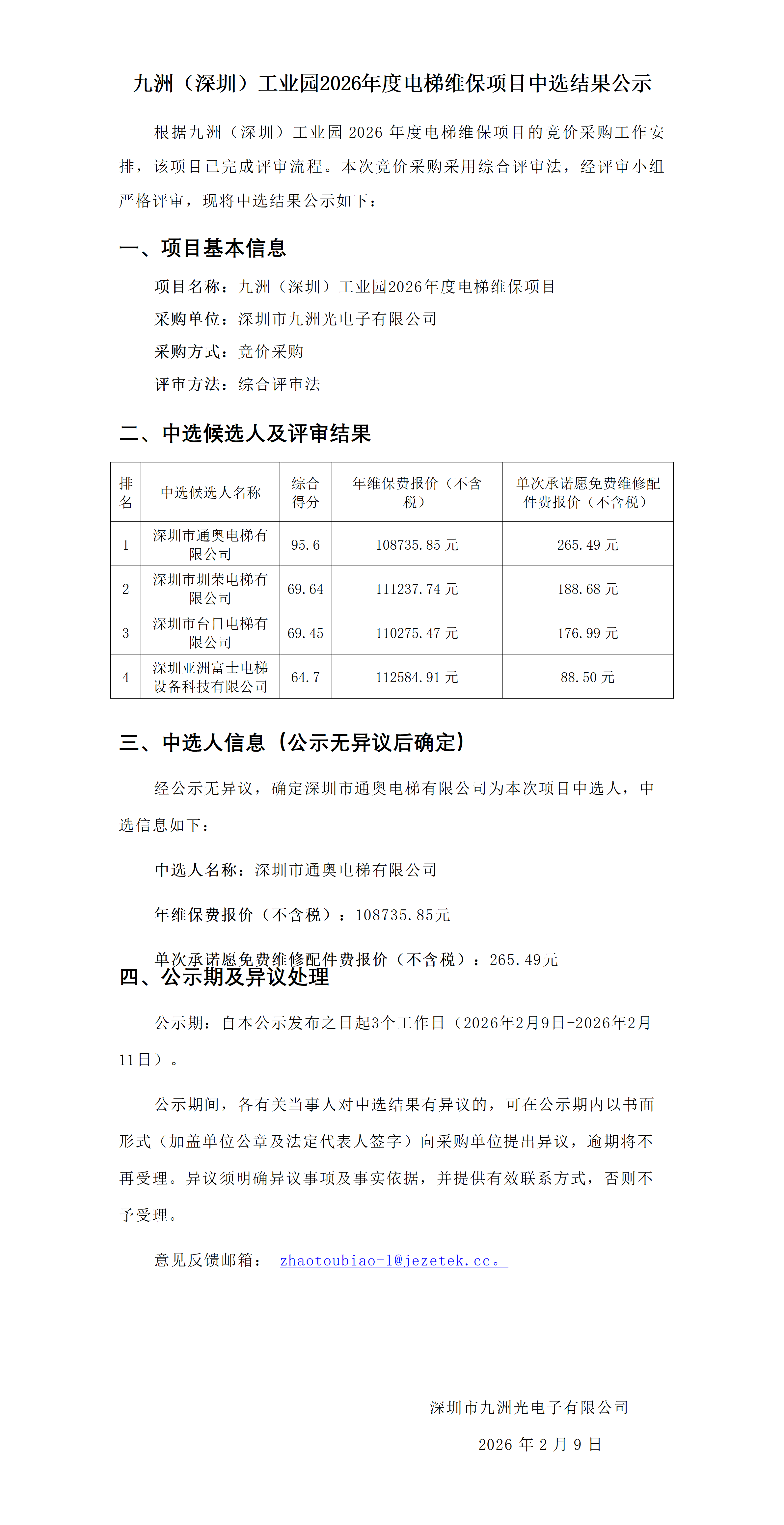 九洲(深圳)工业园2026年度电梯维保项目中选结果公示