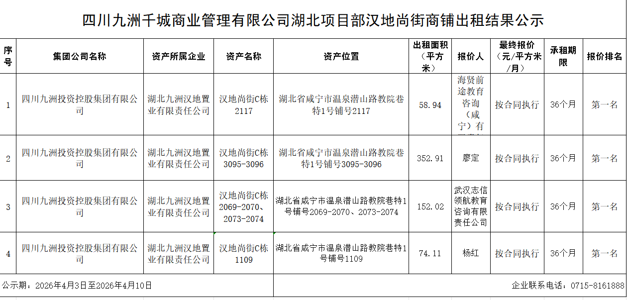 四川九洲千城商业管理有限公司湖北项目部汉地尚街商铺出租结果公示