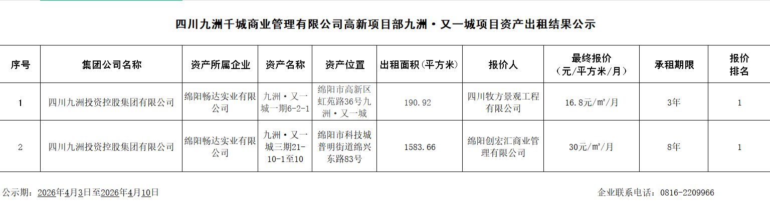 四川九洲千城商业管理有限公司高新项目部九洲·又一城项目资产出租结果公示